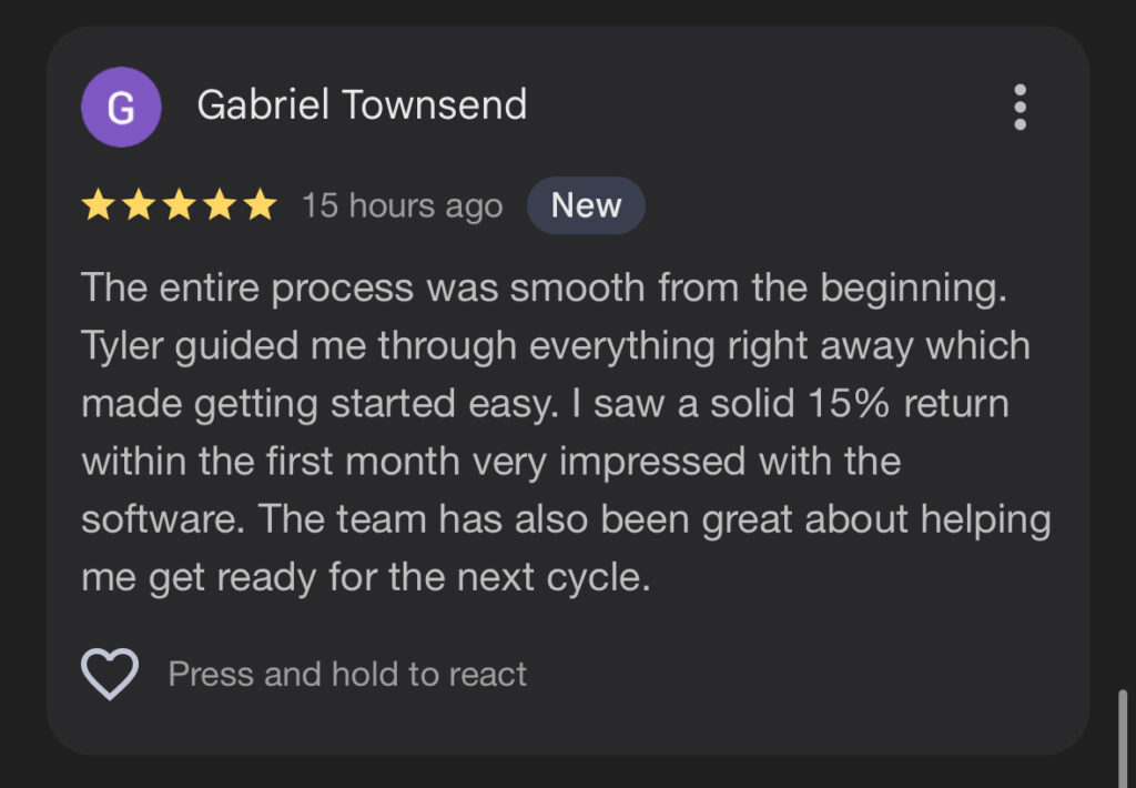 While returns vary based on market conditions and capital deployed, our target monthly ROI ranges between 15% and 20%. Our software gives you live access to track performance.